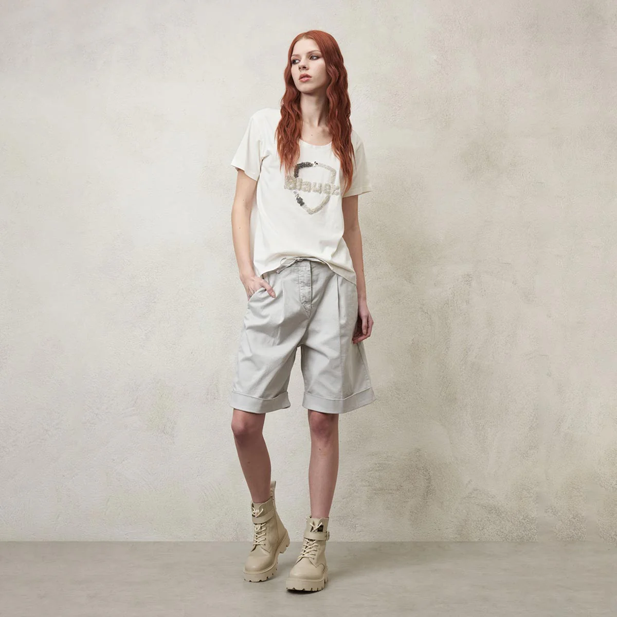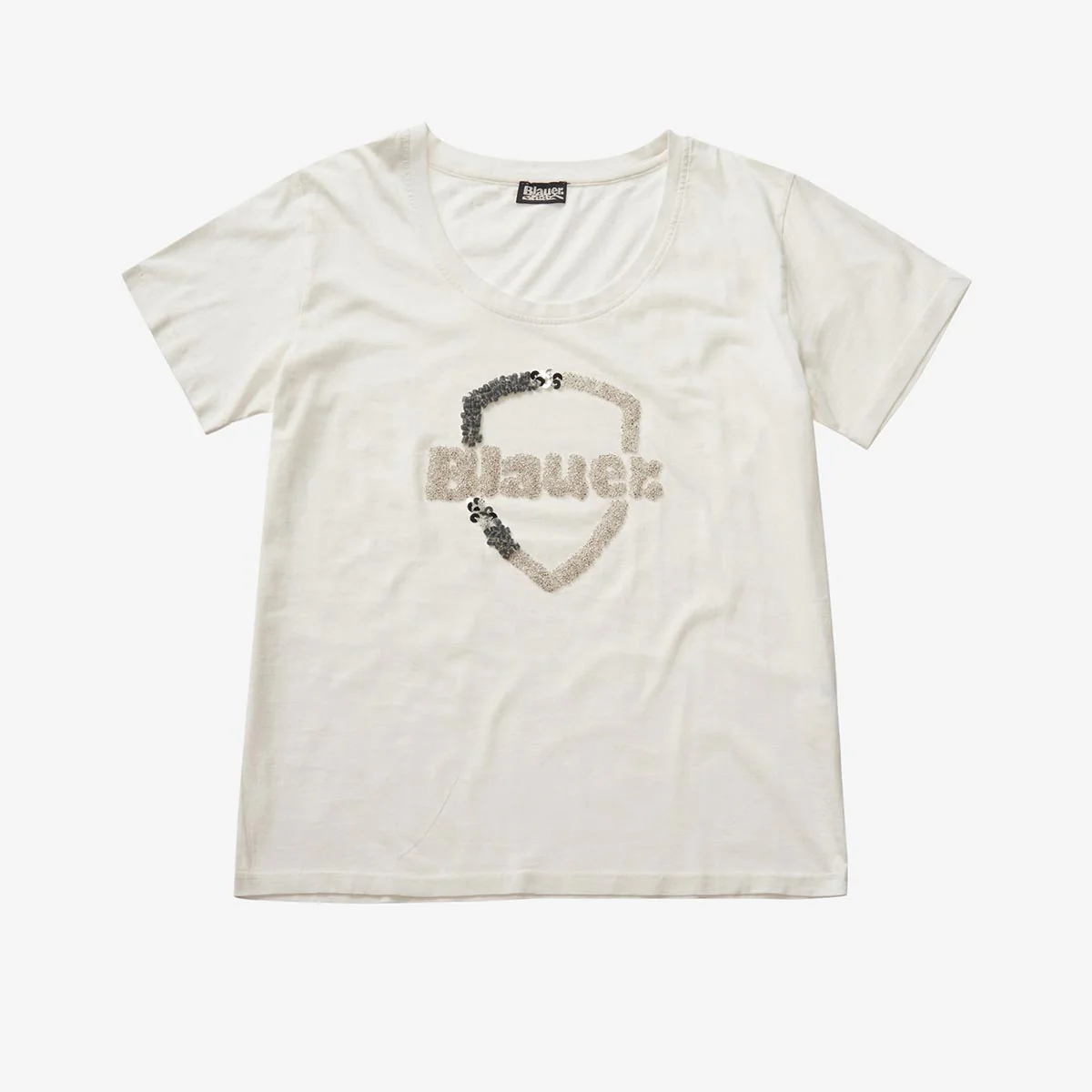 Decoro con paillettes varie sullo scudo e scritta Blauer sul petto.