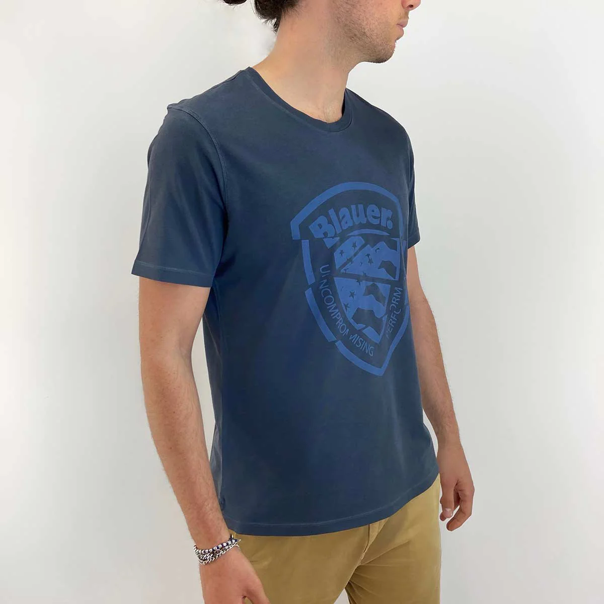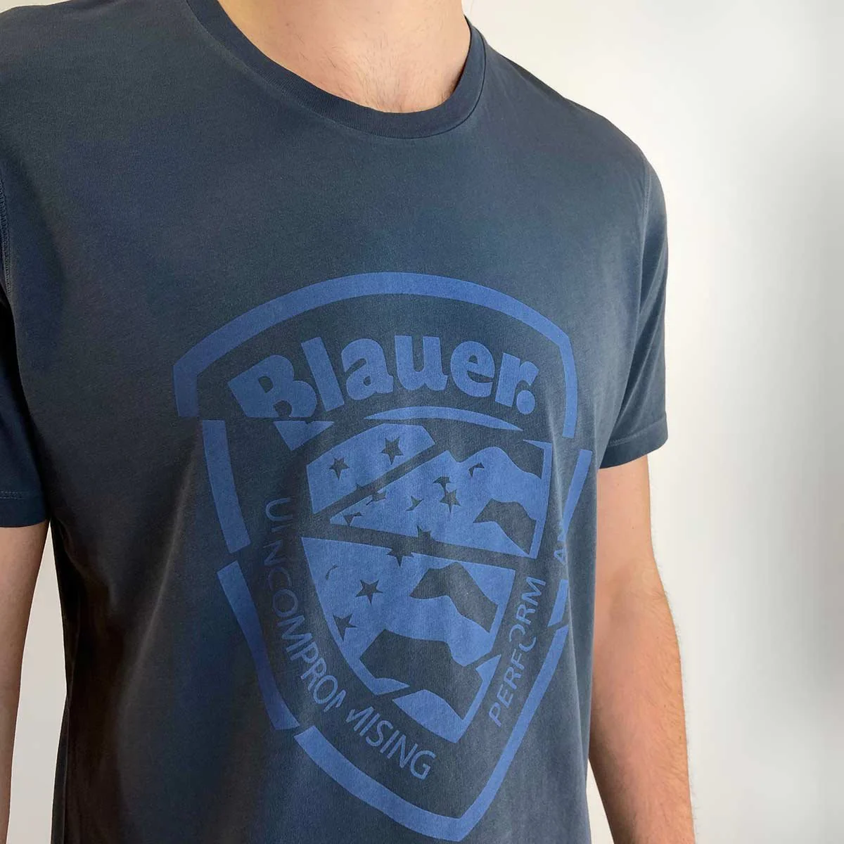 T-shirt uomo, a manica corta, in jersey. Girocollo a costina. Stampa con scudo Blauer sul petto davanti dall’effetto tagliato in contrasto colore.