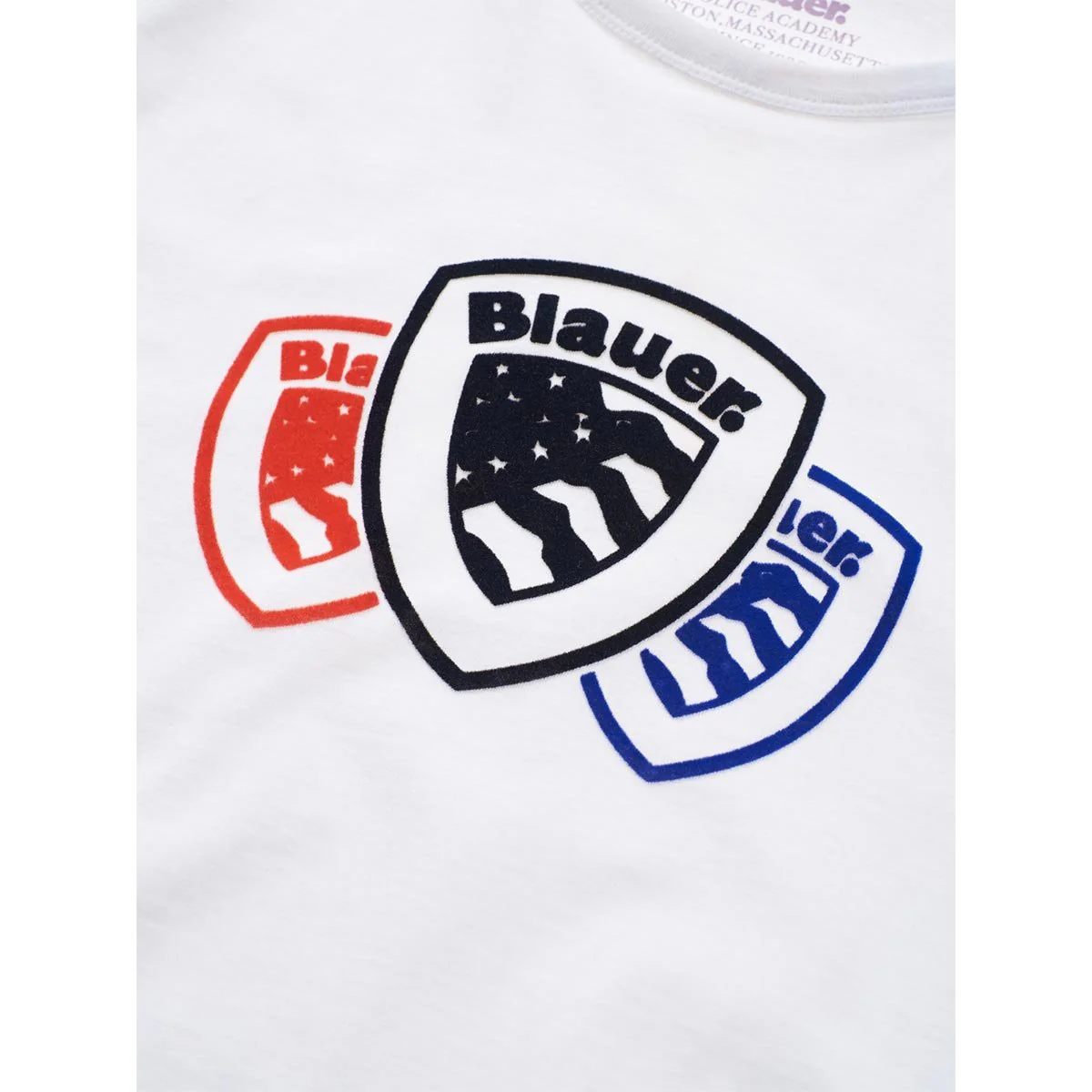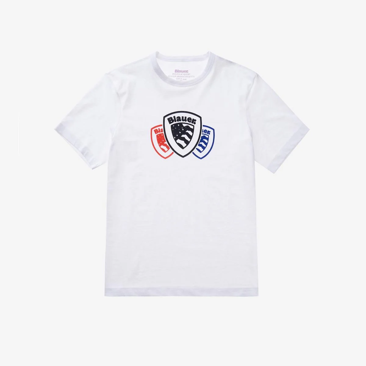 T-shirt uomo a manica corta in jersey di cotone. Girocollo a costina in tono.Stampa nel petto al centro con tre scudi Blauer sovrapposti in tre colori diversi e dall’effetto velluto.Tessuto morbido e comodo.