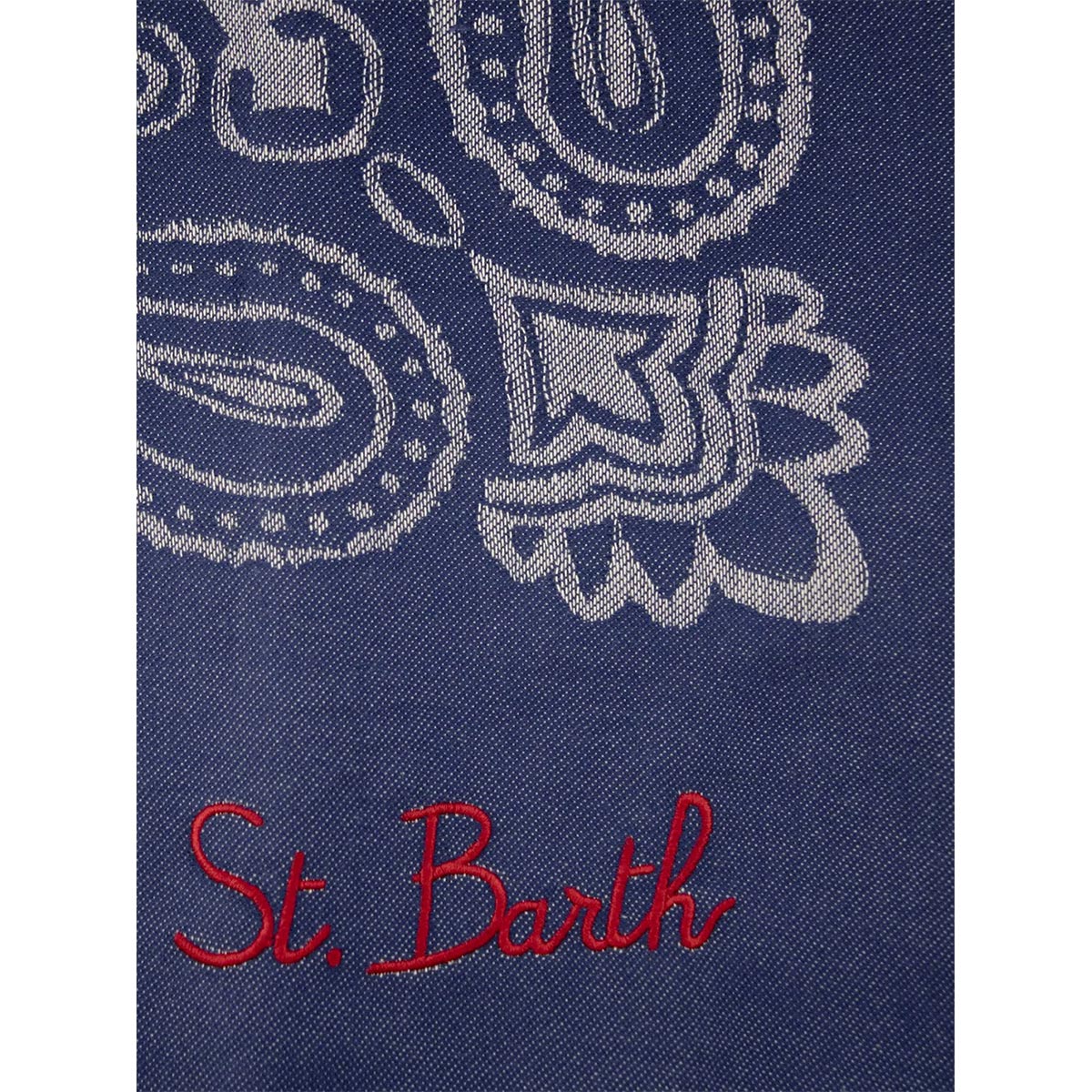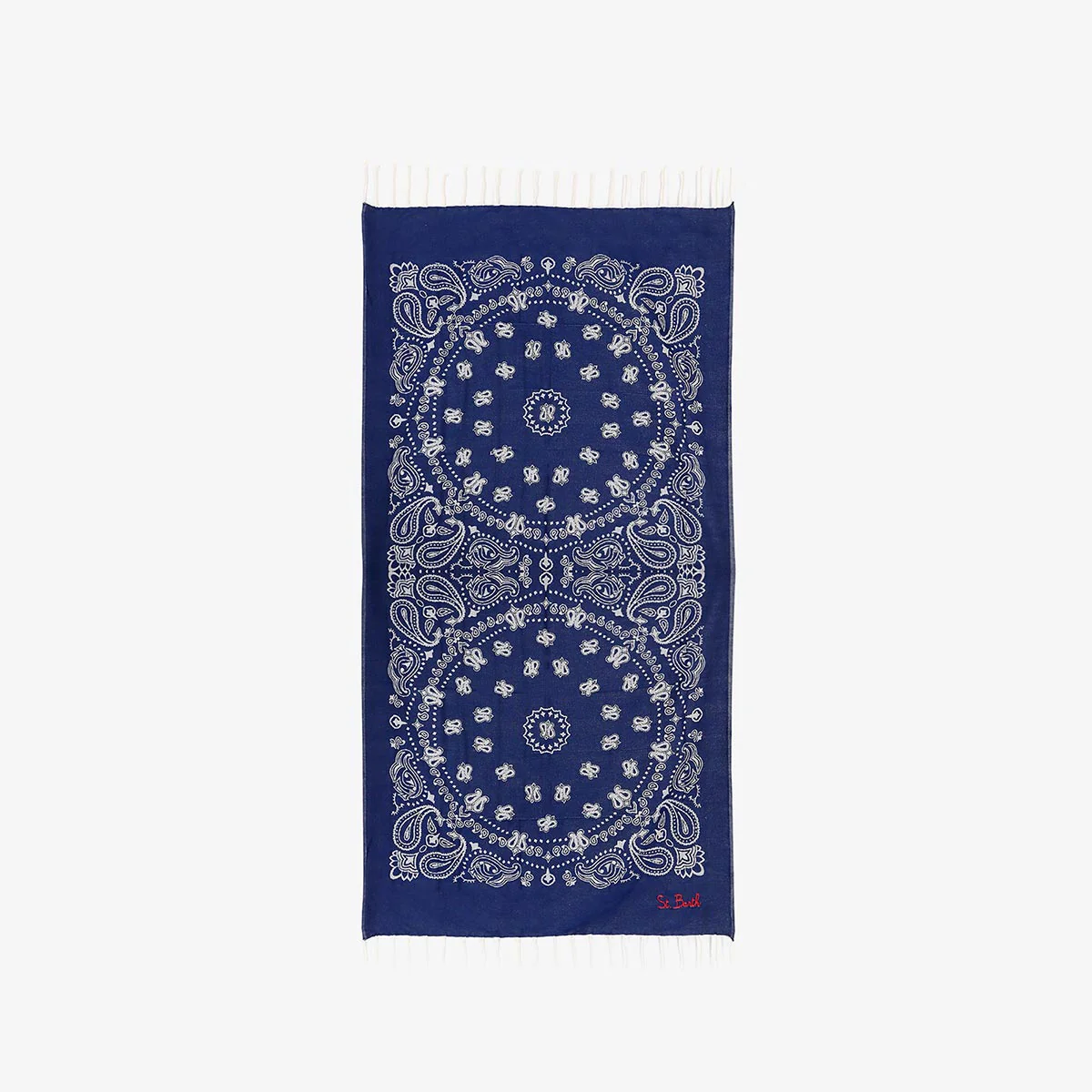 Telo mare tradizionale con frange bianche, stampa bandana blu con disegno all over, ricamo logo Saint Barth. Ampio, leggero, si asciuga rapidamente ed è realizzato con materiale naturale.