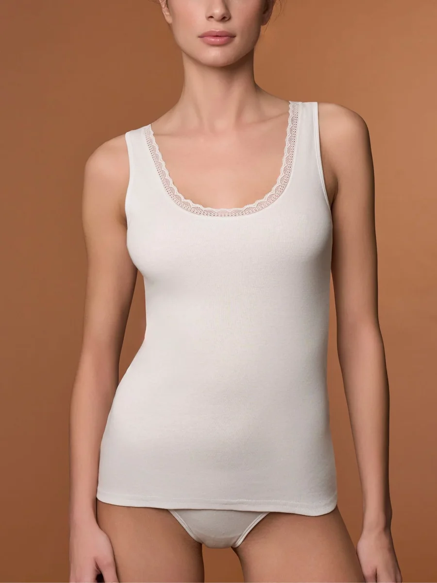 Il suo design elegante è impreziosito da un bordino in pizzo delicatamente applicato lungo lo scollo, conferendo un tocco di raffinatezza e femminilità al capo.