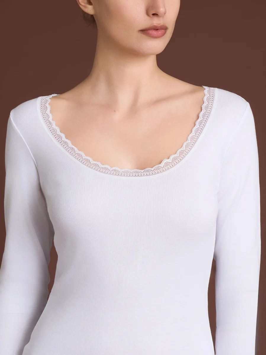 Il suo design elegante è impreziosito da un bordino in pizzo delicatamente applicato lungo lo scollo, conferendo un tocco di raffinatezza e femminilità al capo.