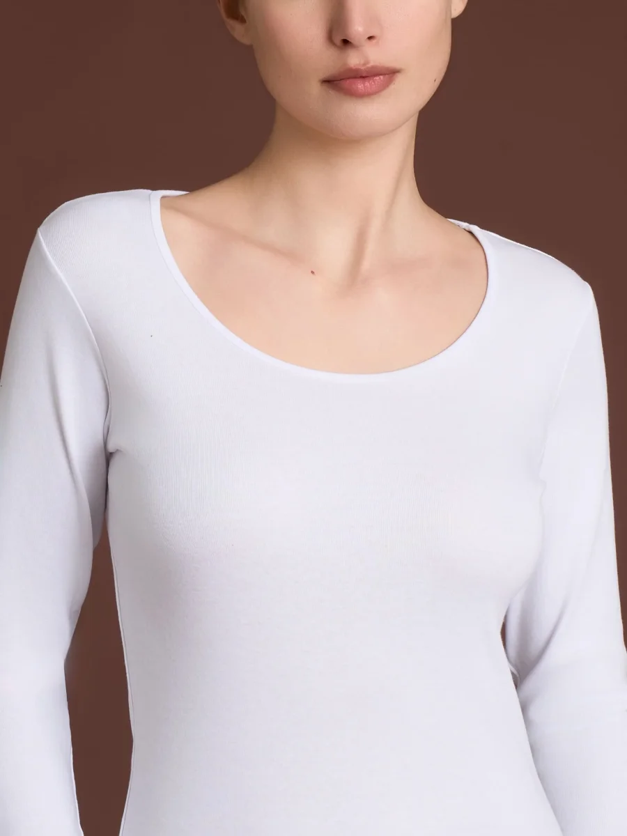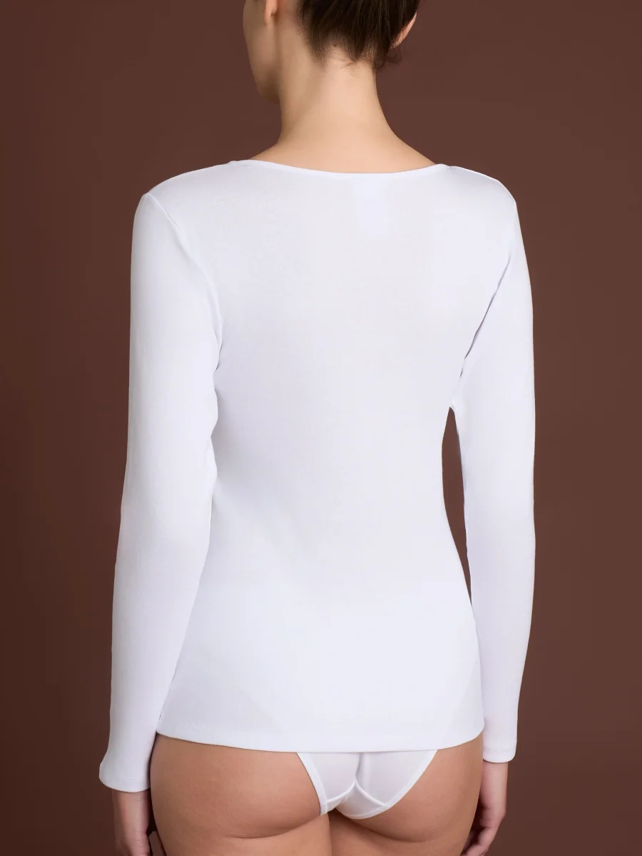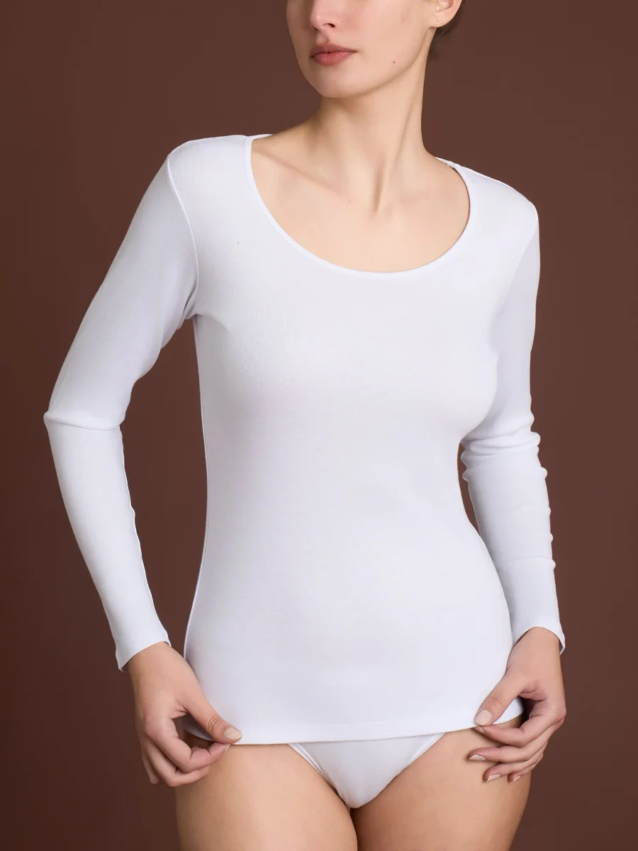 Maglietta con girocollo ampio e a manica lunga in maglia unita, realizzata in caldo cotone ed in costina 1×1.