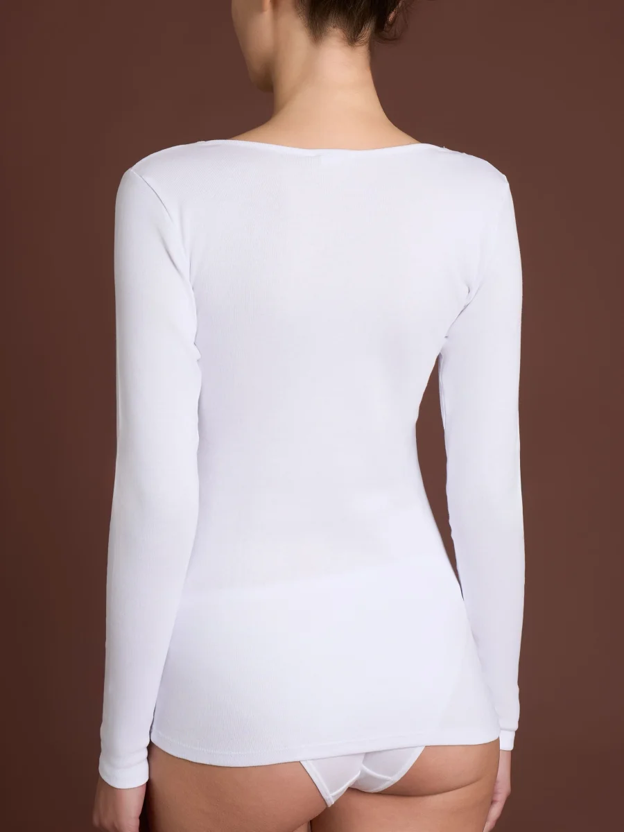 Maglietta girocollo a manica lunga in maglia unita, realizzata in caldo cotone ed in costina 1×1.