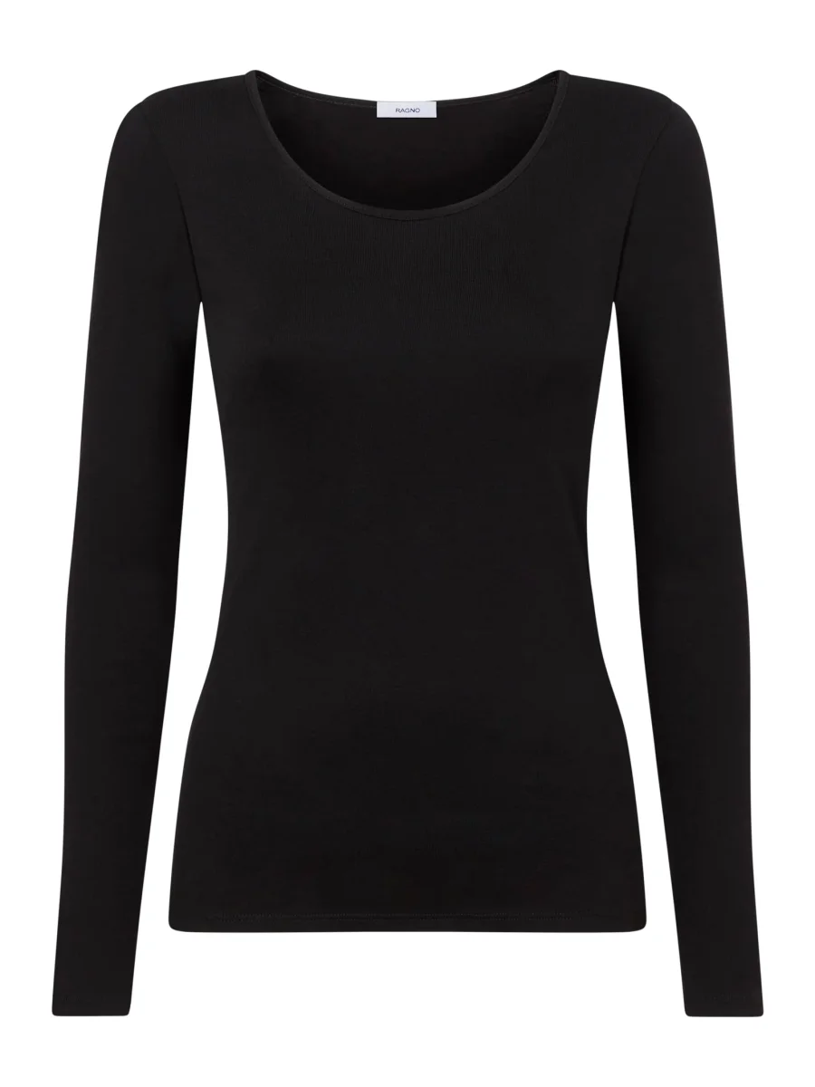Maglietta con girocollo ampio e a manica lunga in maglia unita, realizzata in caldo cotone ed in costina 1×1.