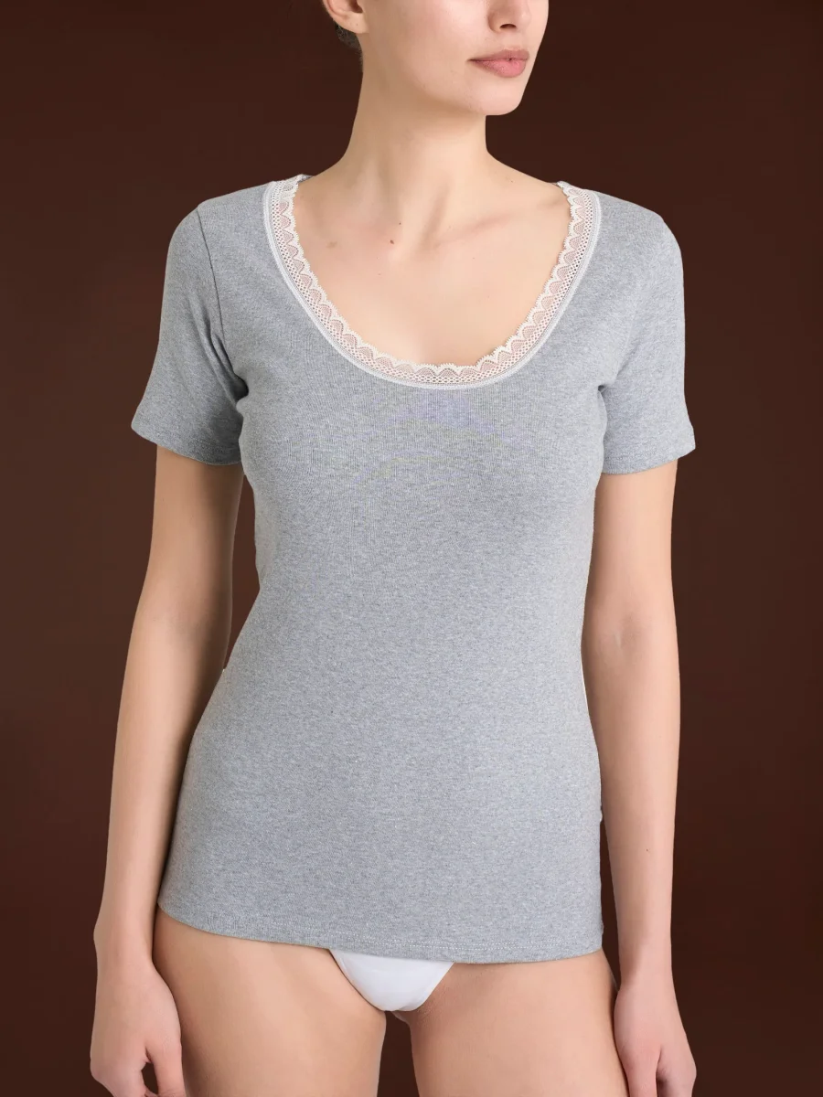 Il suo design elegante è impreziosito da un bordino in pizzo delicatamente applicato lungo lo scollo, conferendo un tocco di raffinatezza e femminilità al capo.