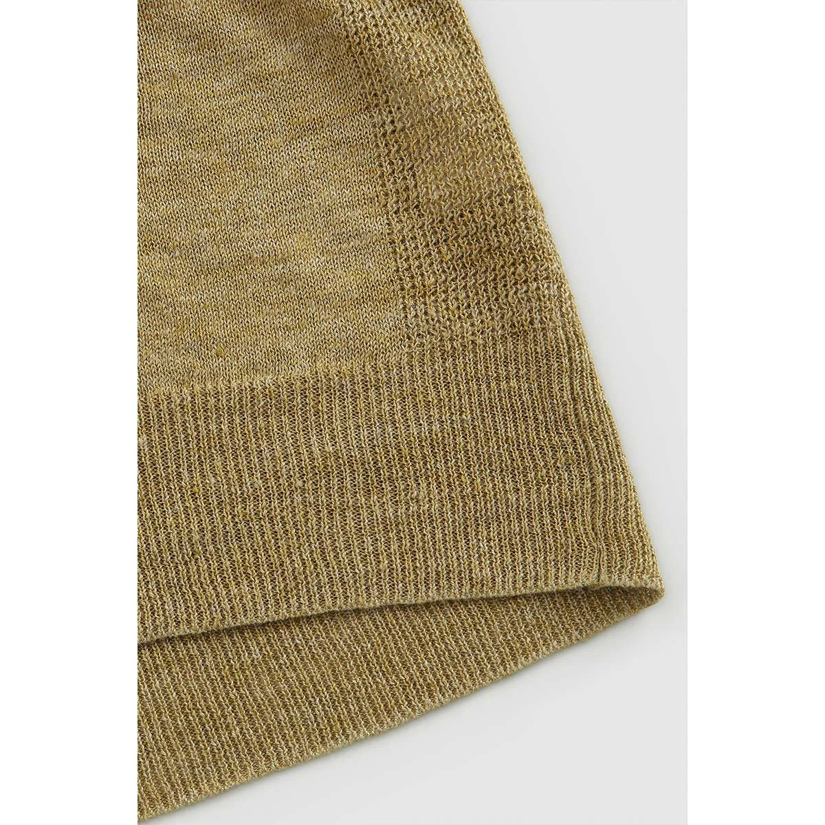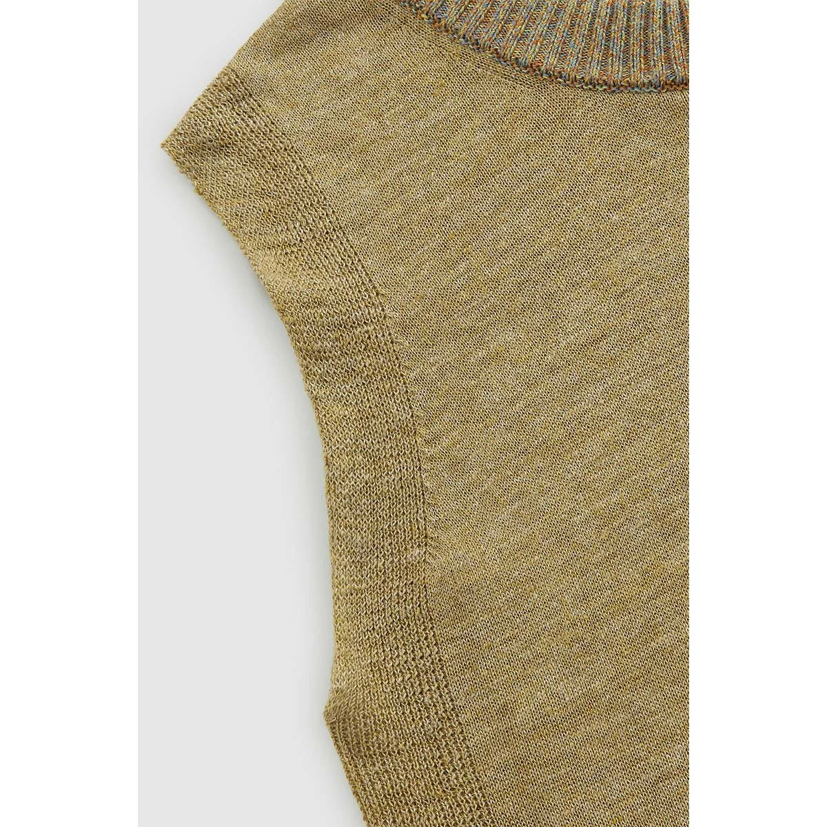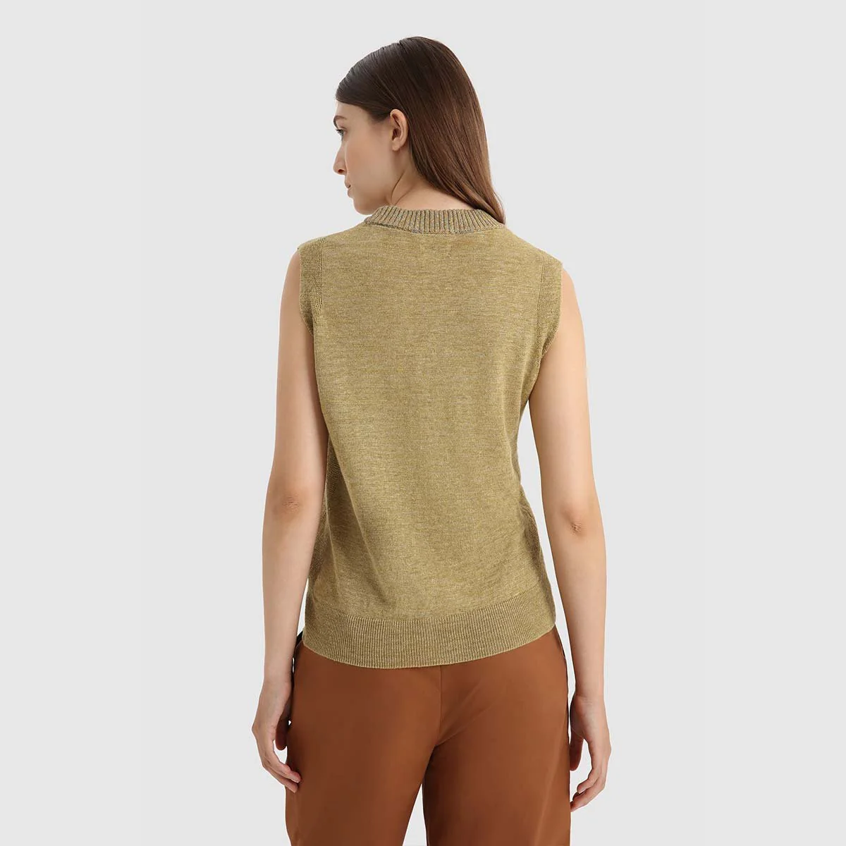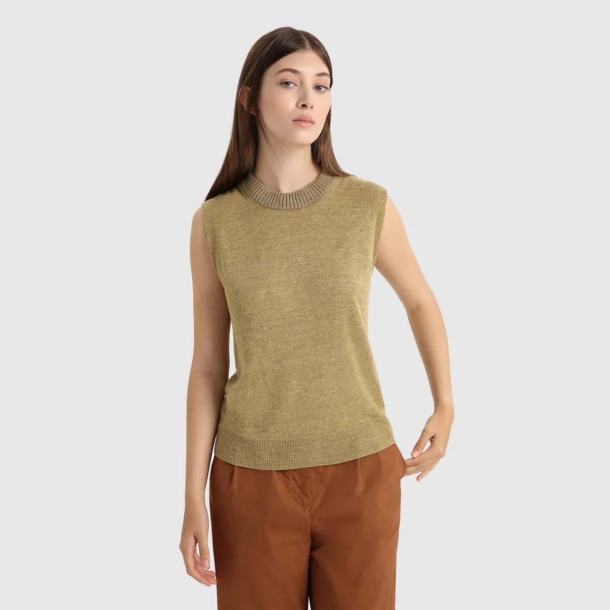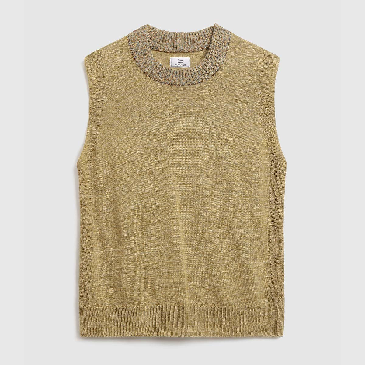 Realizzato in tessuto ultra leggero misto lino, modello senza maniche presenta coste verticali. Rifinito con colletto e orlo a coste.