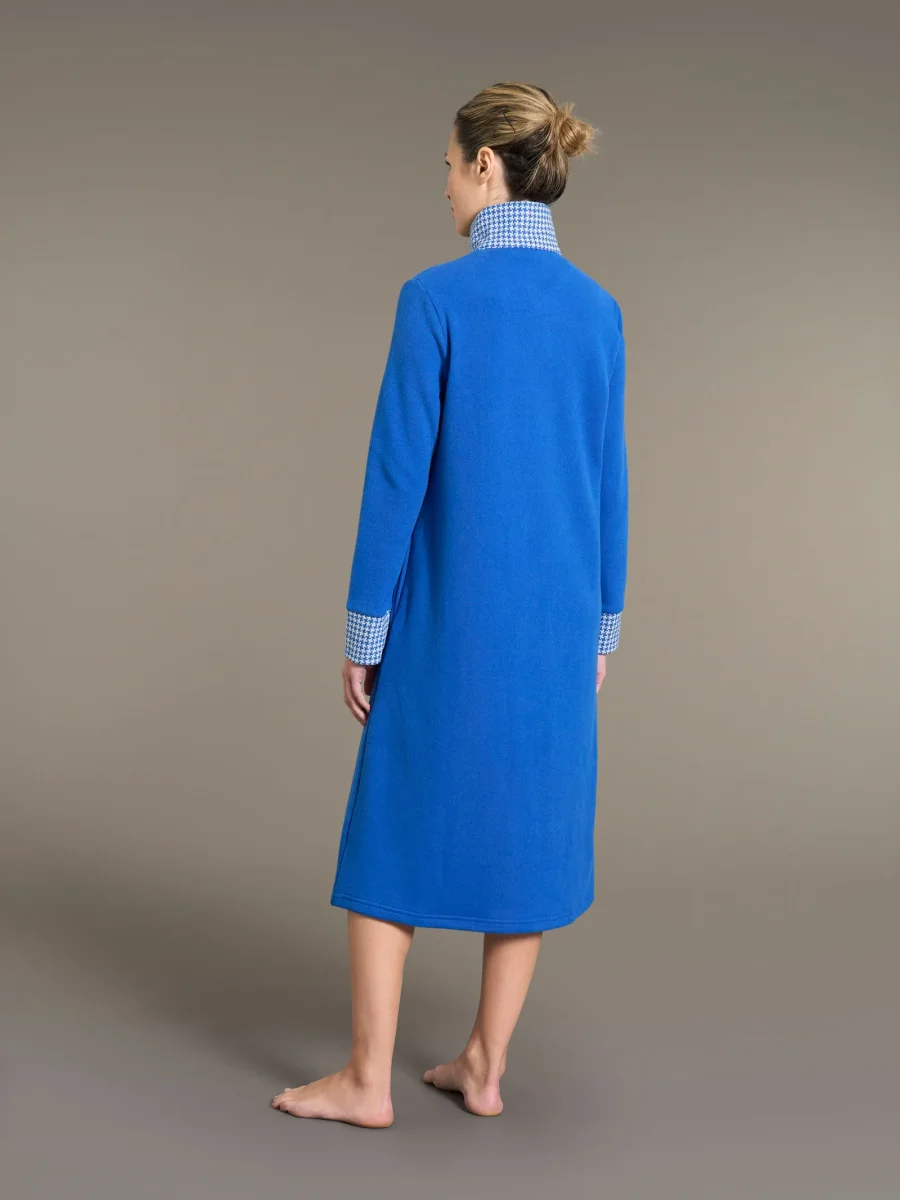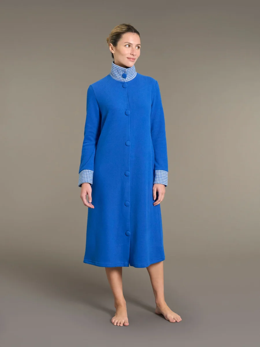 Realizzata in Cotton Eco Pile, un tessuto morbido e avvolgente, questa vestaglia presenta un design elegante a tinta unita con collo e polsini in fantasia pied de poule.