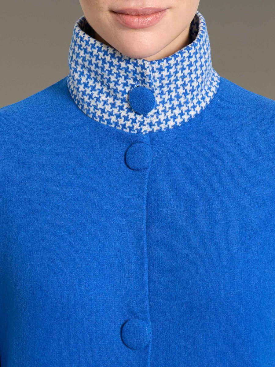 I bottoni rivestiti completano il look elegante e pratico della vestaglia, mentre il collo alto avvolge delicatamente donando un’ulteriore sensazione di calore senza compromettere il design complessivo.