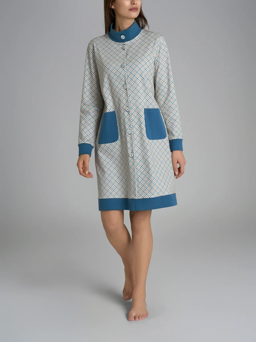 Caratterizzata da un collo alto e dall’apertura con bottoni che ne facilitano l’indosso, questa vestaglia è perfetta per avvolgerti in un comfort accogliente.
