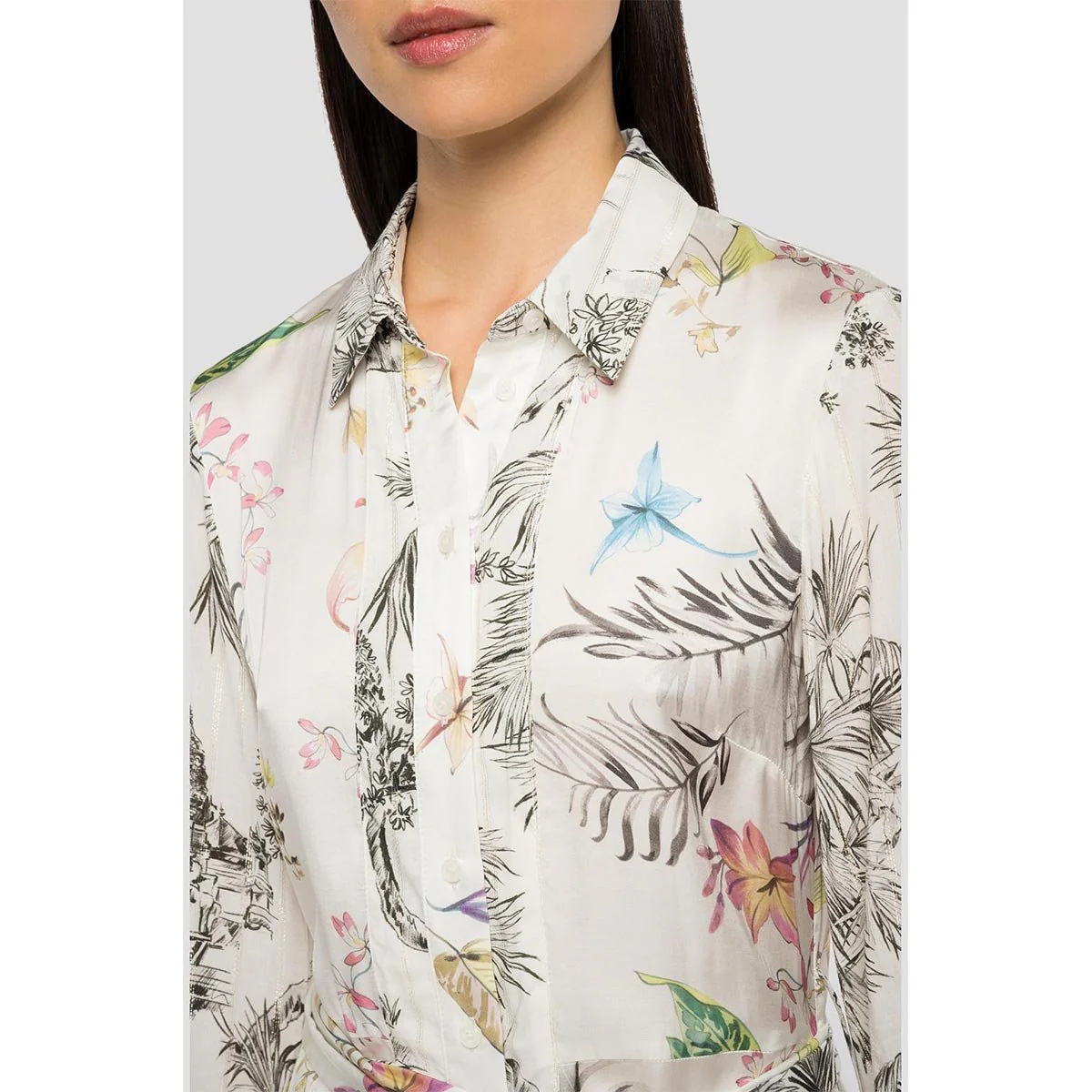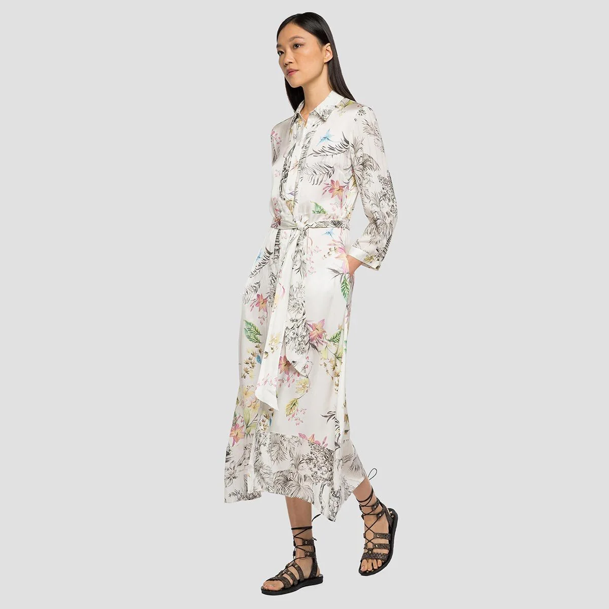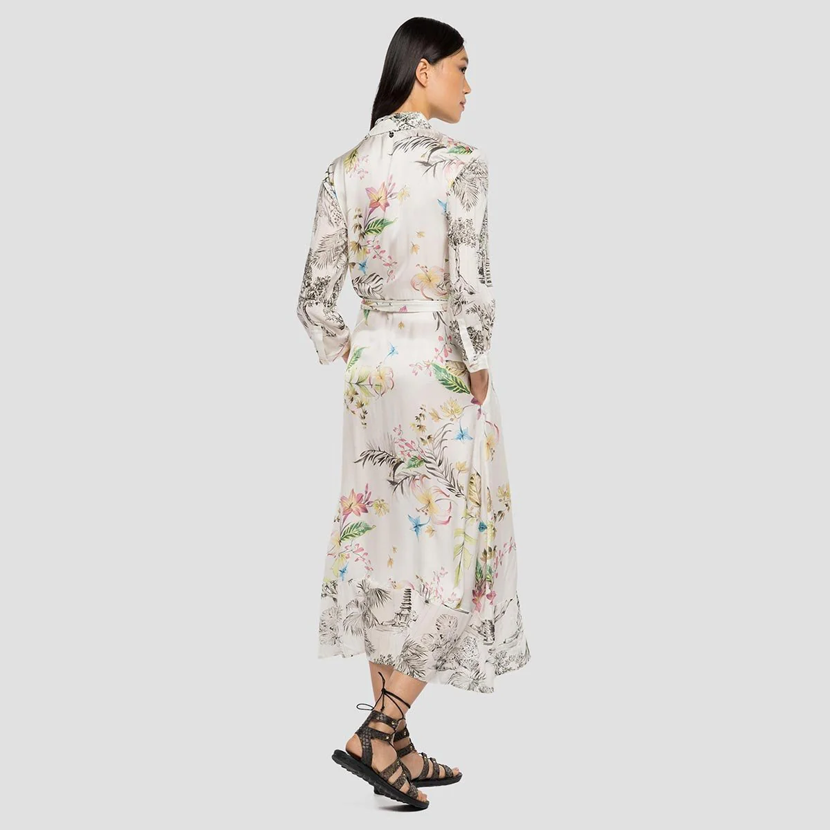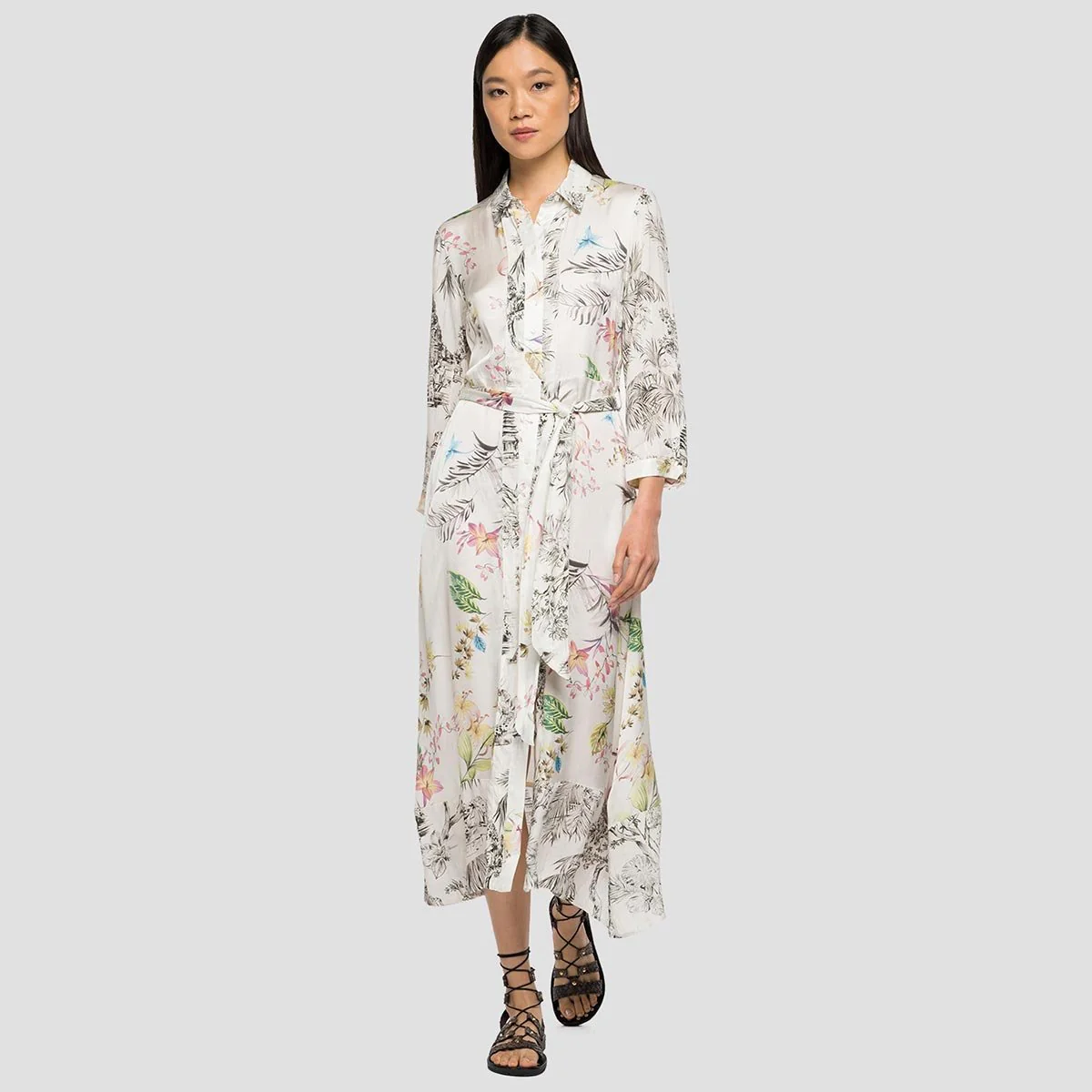Vestito lungo donna in lurex con mix di stampa tema Thailandia e floreale all-over, regular fit, colletto classico, maniche lunghe, polsi con bottone singolo, cintura annodata in vita sul davanti, balza al fondo, chiusura con bottoni.