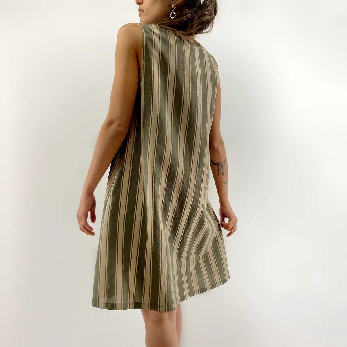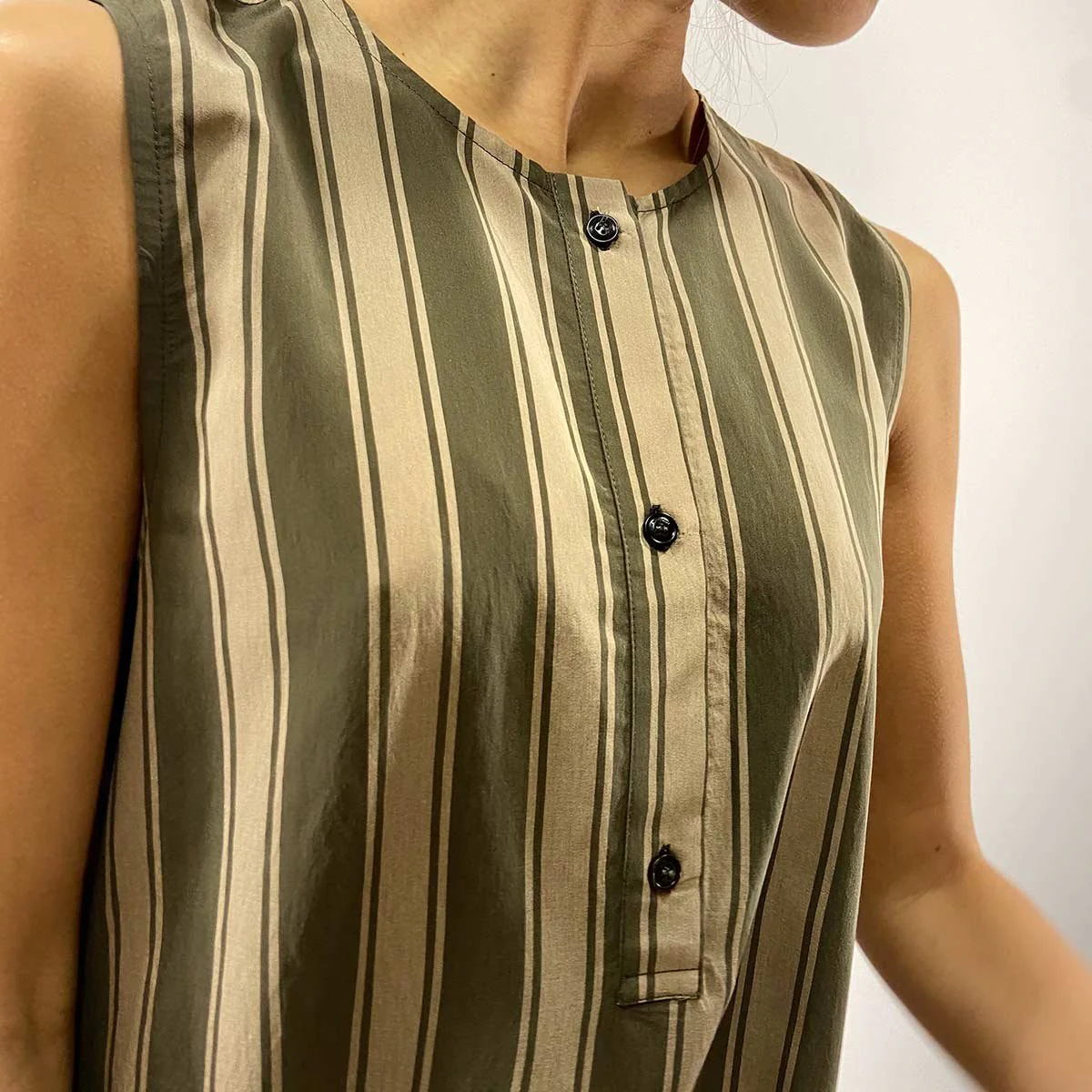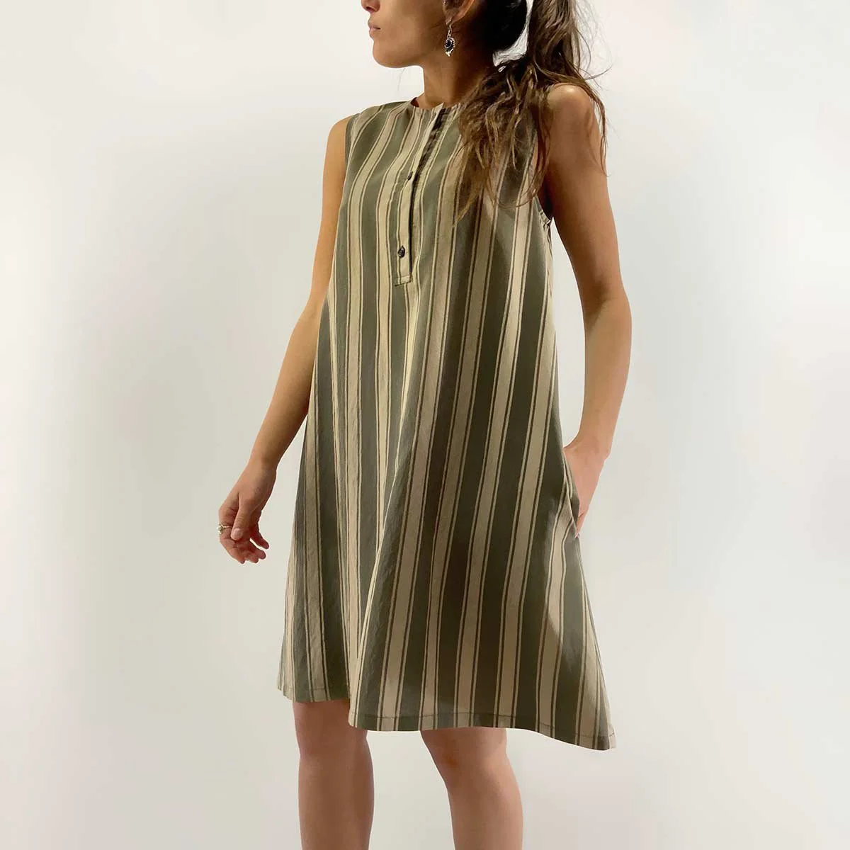 Vestito smanicato in viscosa a righe, fondo svasato con tasche laterali, chiusura con bottoni fino al petto