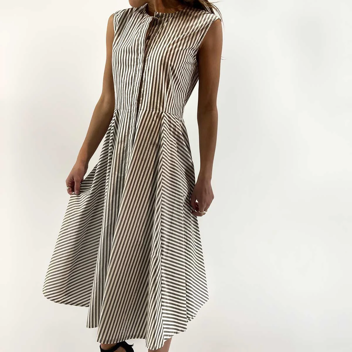 Vestito a righe in puro cotone smanicato, abbottonatura nascosta e tasche