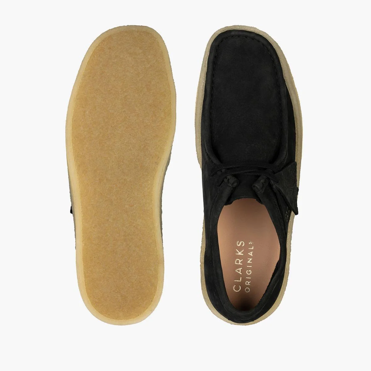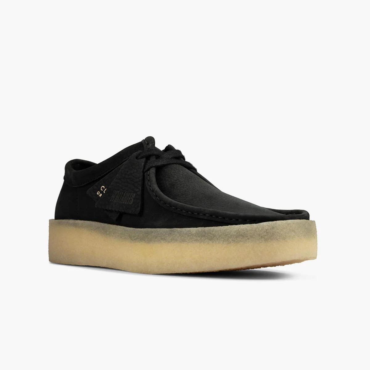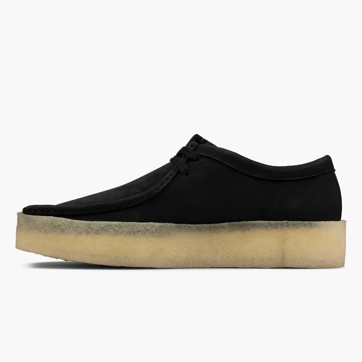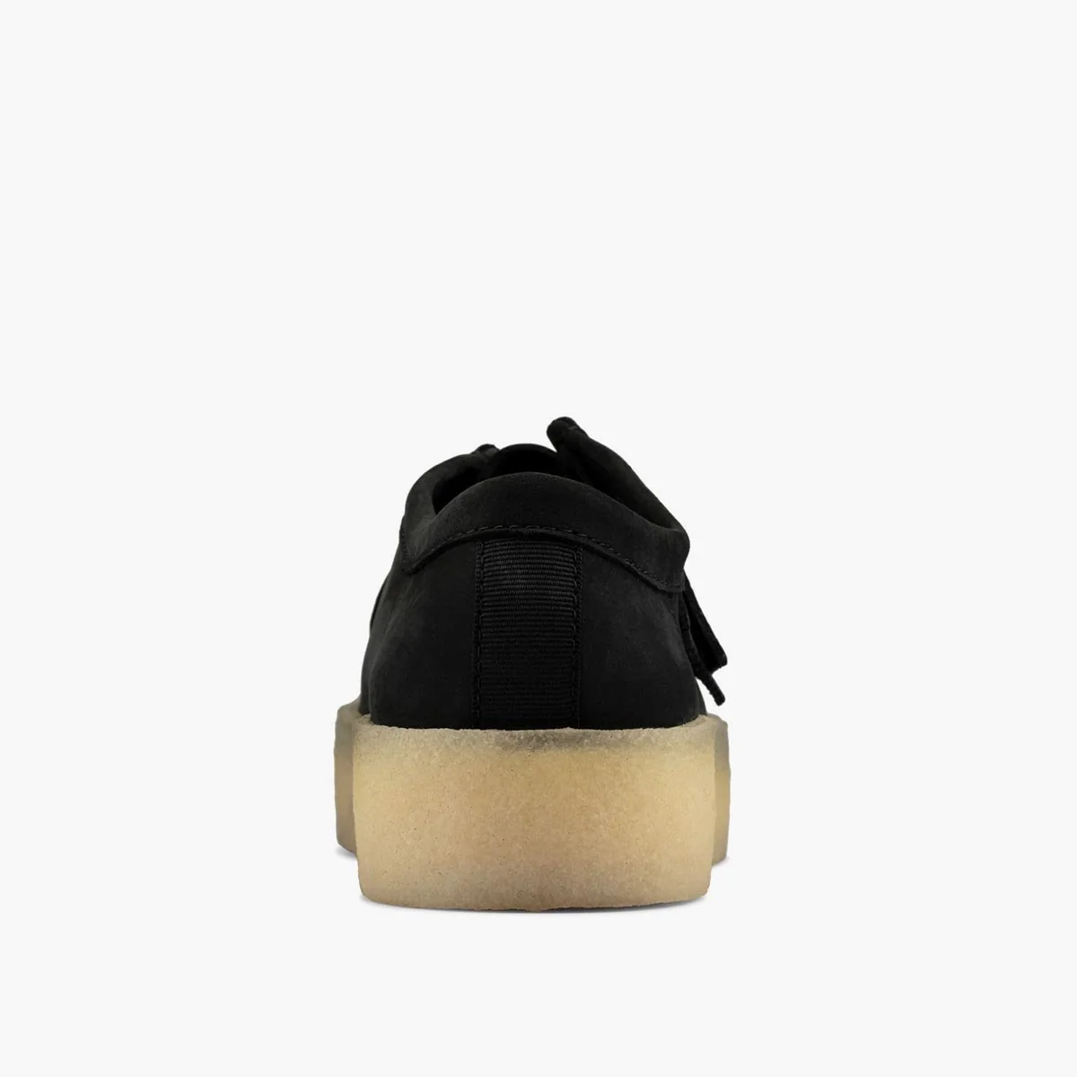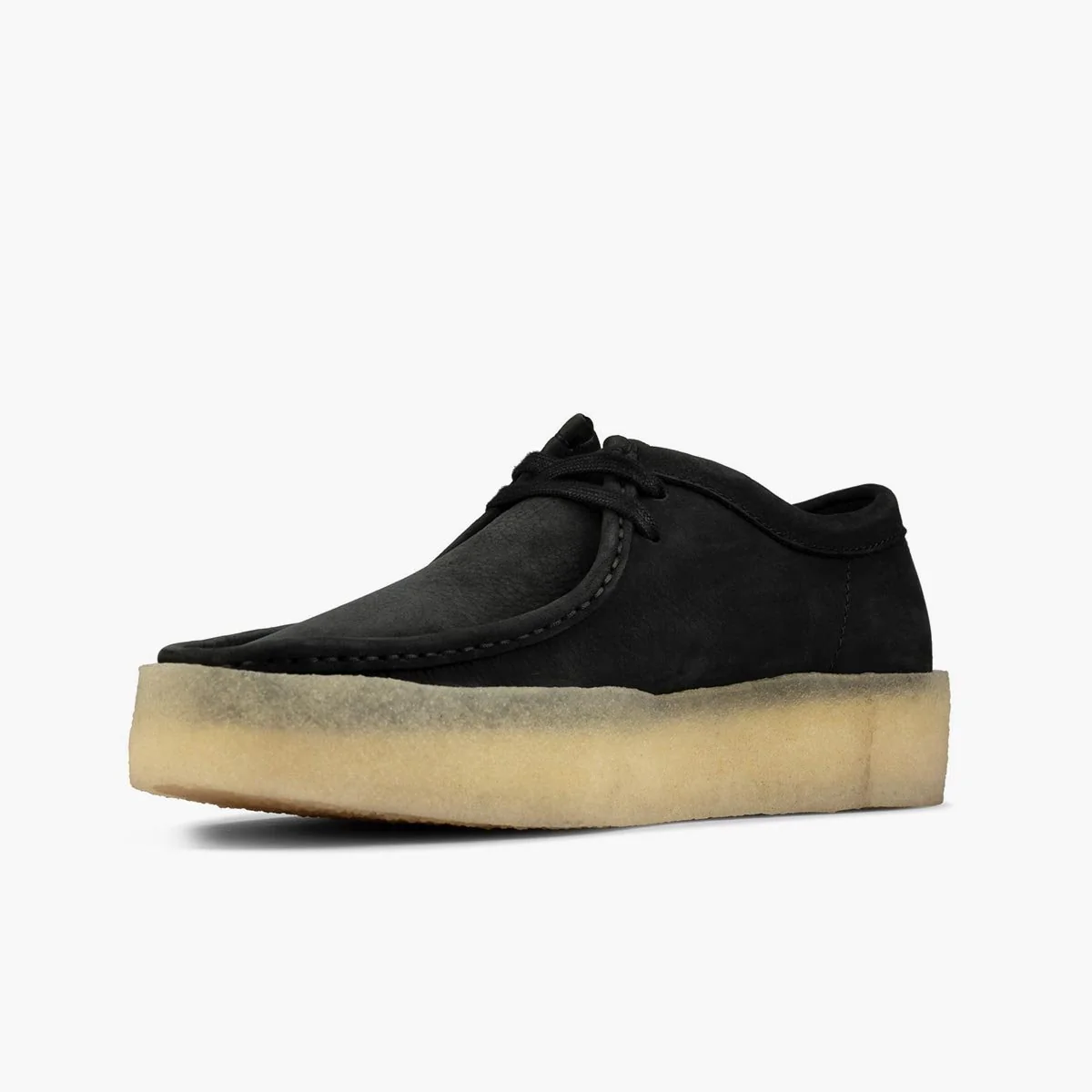 Classico mocassino Wallabee Cup dal taglio basso in nabuk nero è caratterizzato da un robusto rivestimento in para e da una distintiva fettuccia sul tallone.