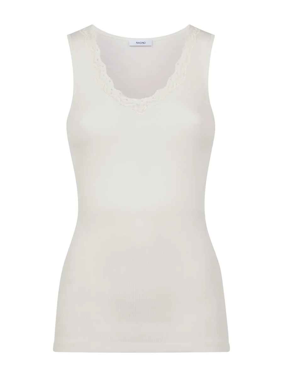 Wonderwool – Canottiera a spalla larga in costina di lana ultrafine con profili in pizzo – B.co Seta