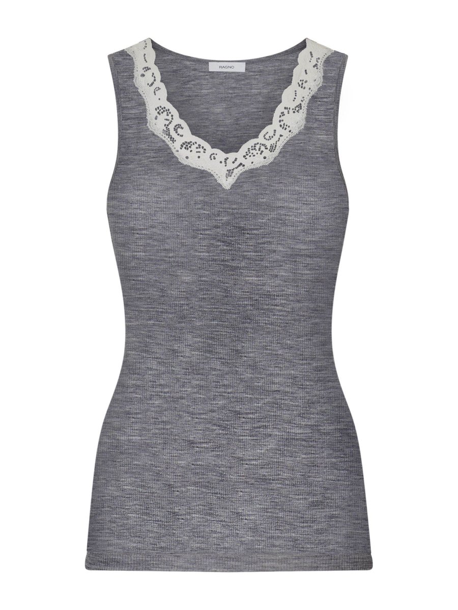 Wonderwool – Canottiera a spalla larga in costina di lana ultrafine con profili in pizzo – Vapore Mel.