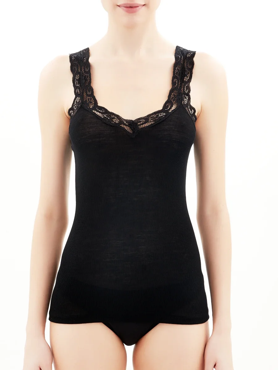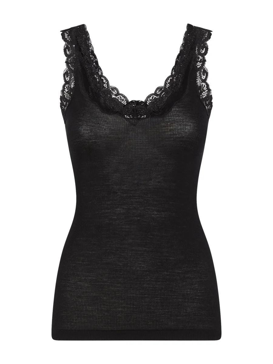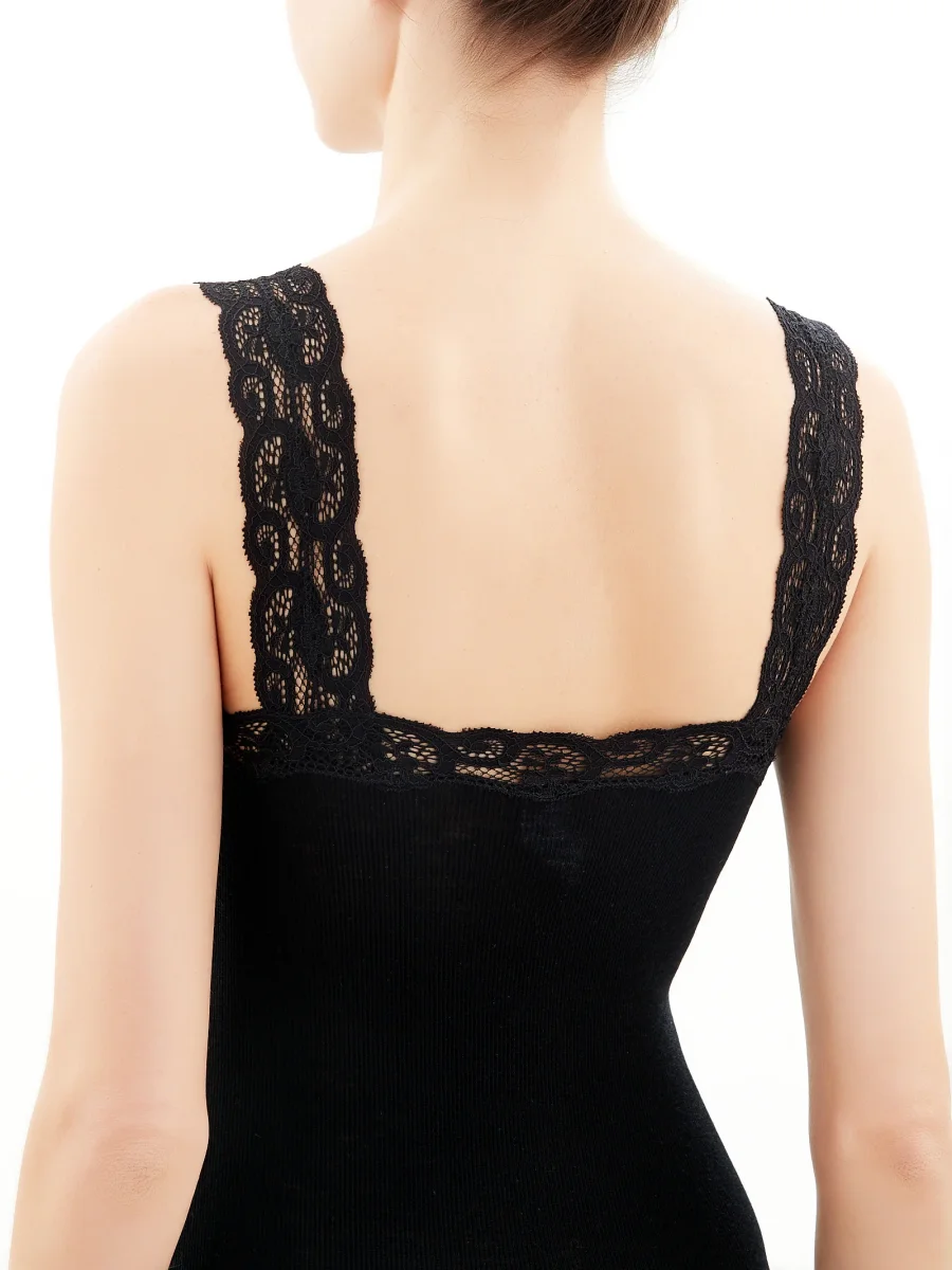 Wonderwool – Canottiera a spalla stretta in costina di lana ultrafine con profili in pizzo. – Nero