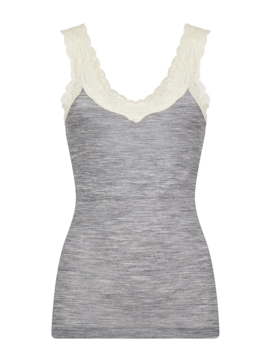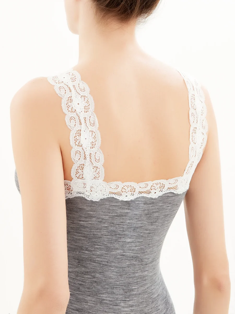Wonderwool – Canottiera a spalla stretta in costina di lana ultrafine con profili in pizzo. – Vapore Mel.