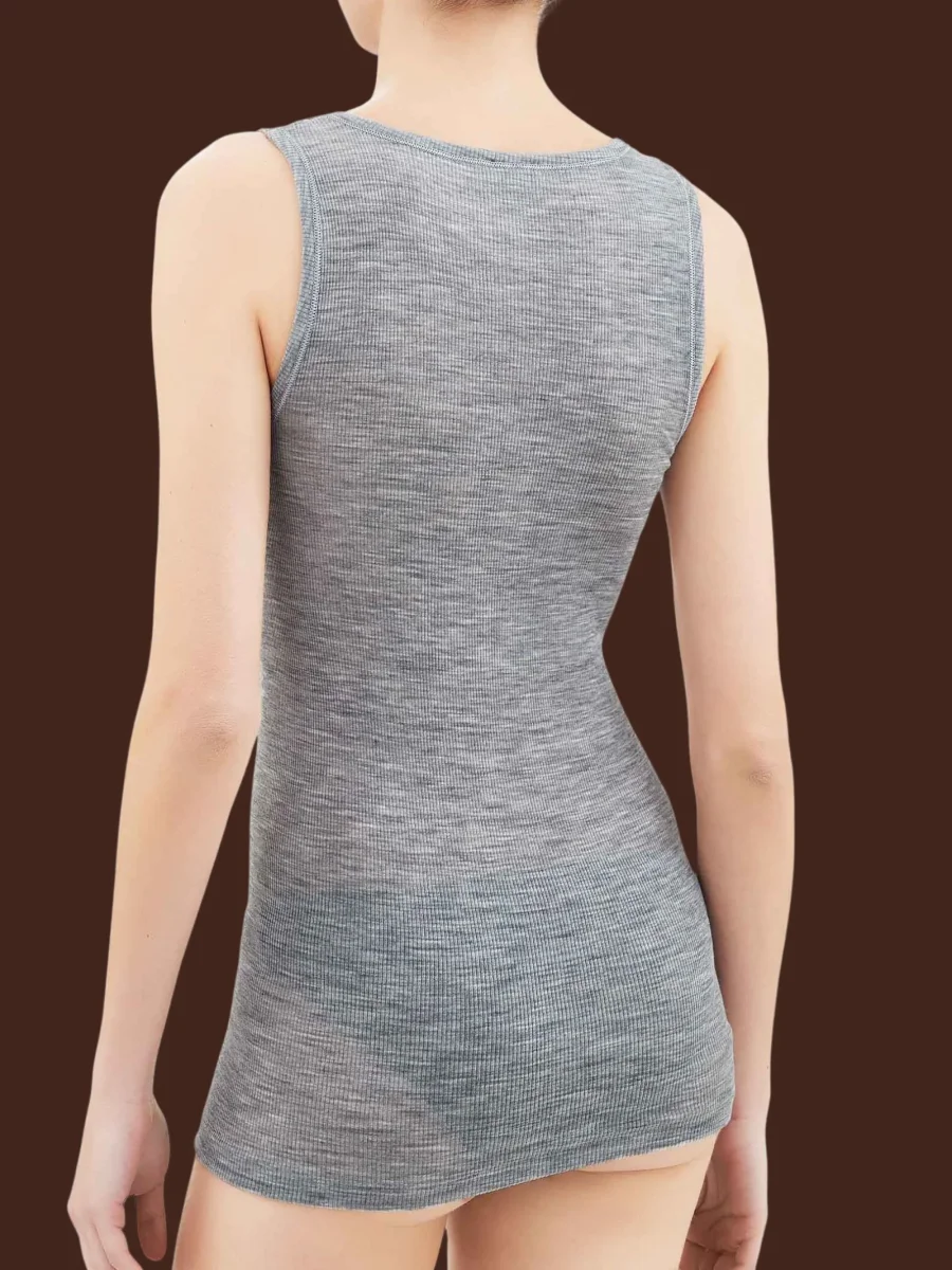 Canottiera a spalla larga in pregiata pura lana ultrafine, sottile e con una sensazionale elasticità naturale fornita dal tessuto a costina 2×1.