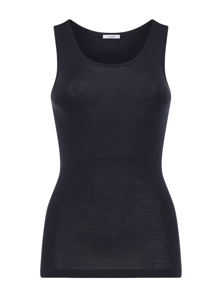 Canottiera a spalla larga in maglia unita di pregiata pura lana ultrafine, sottile e naturale.