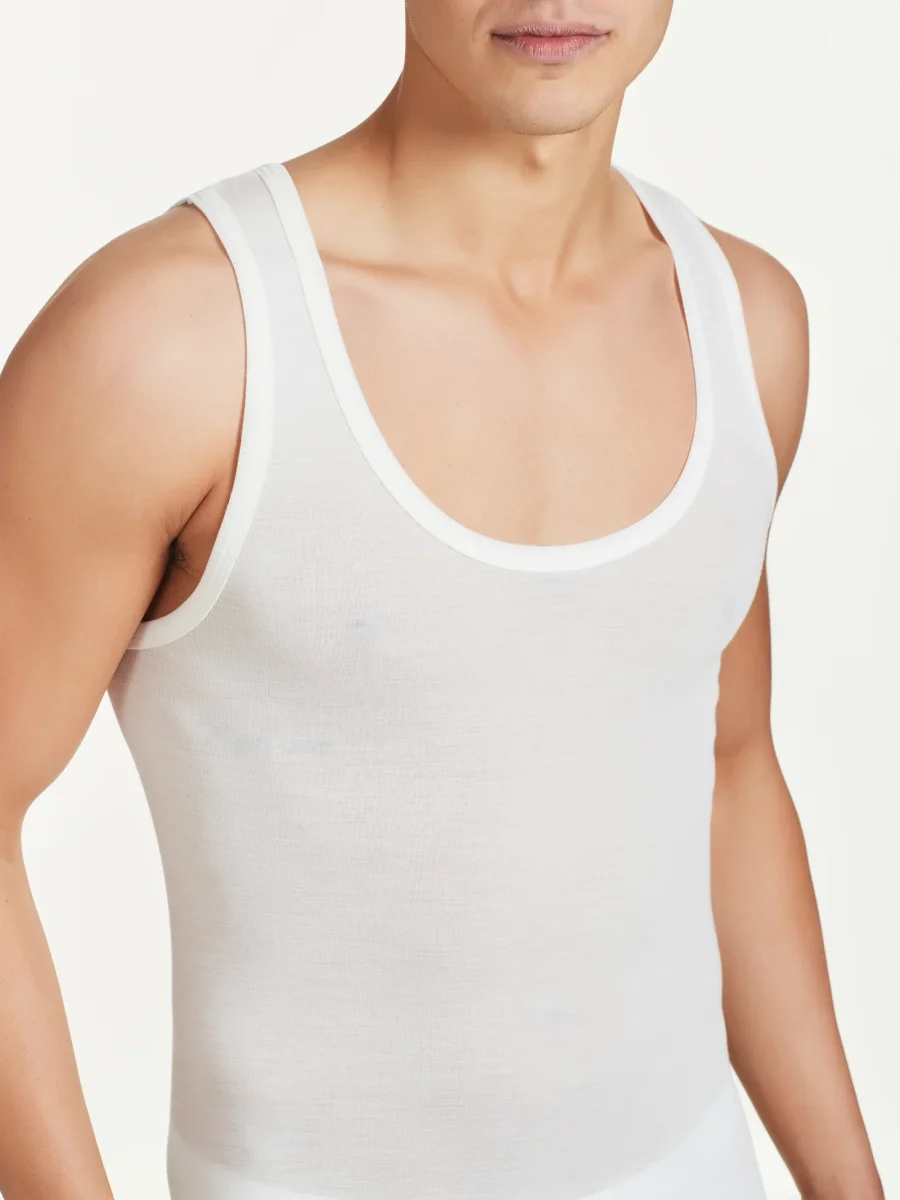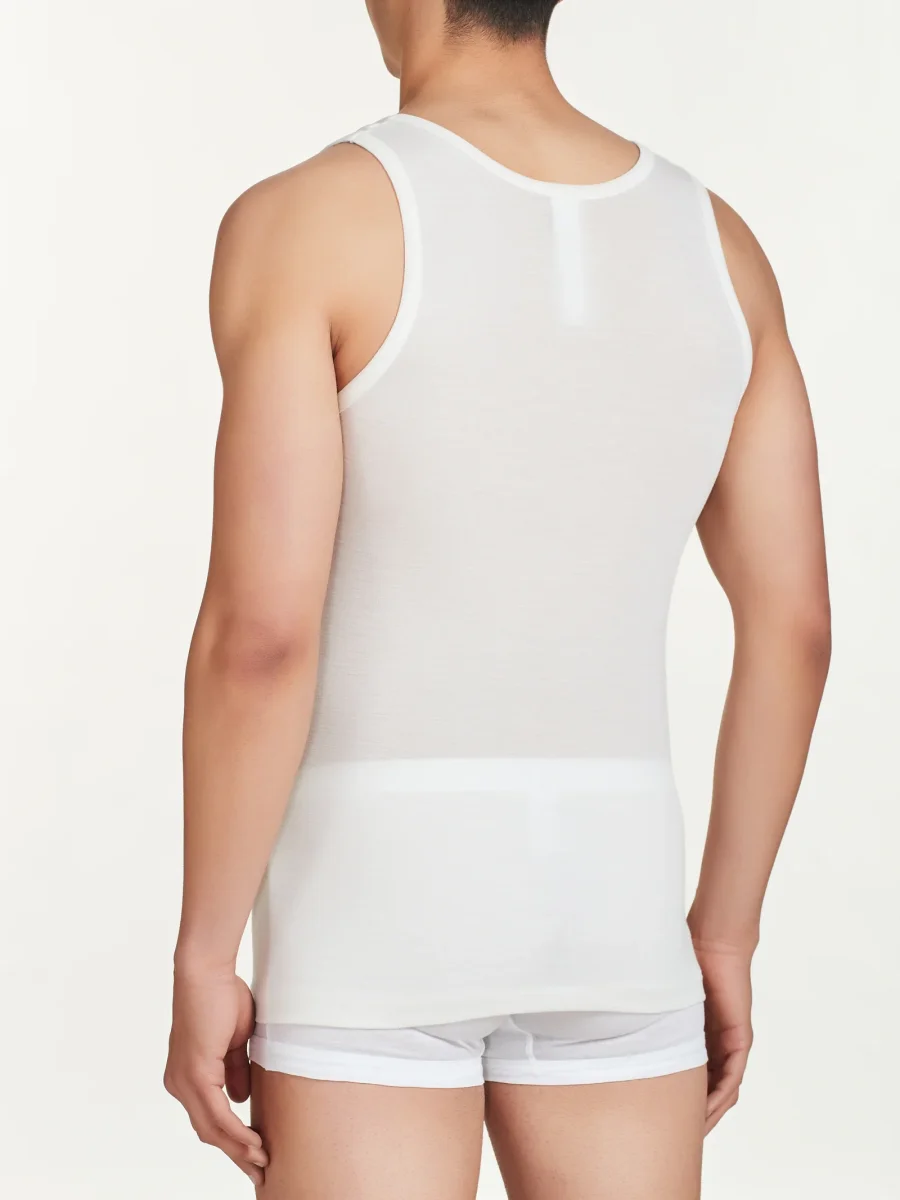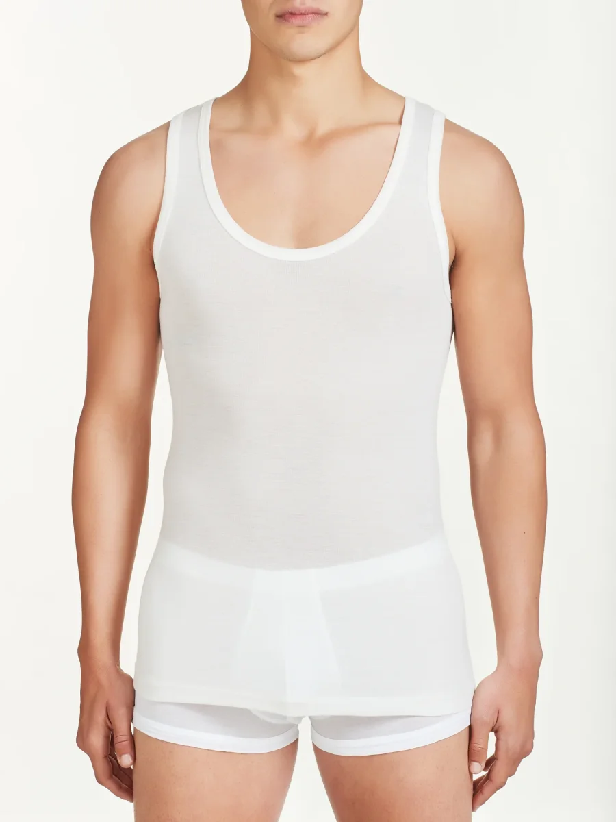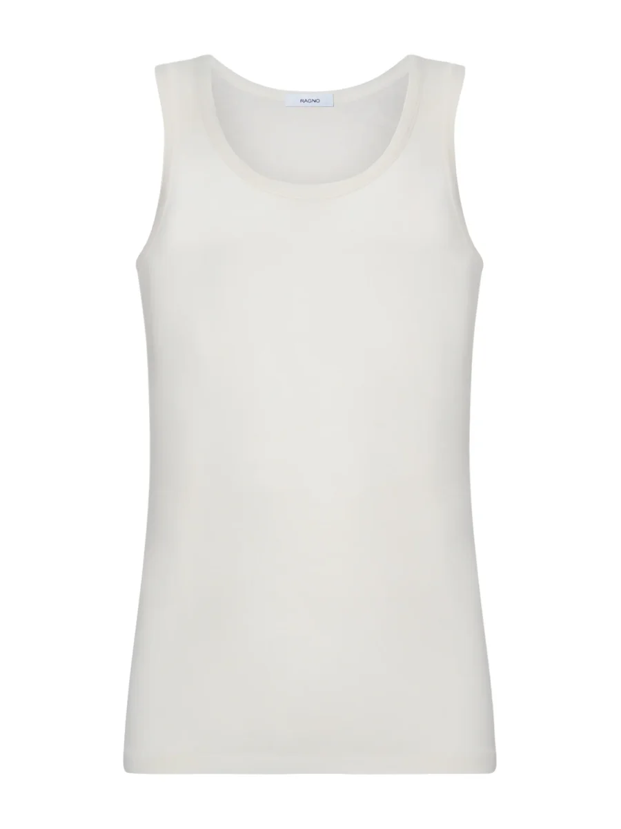 Canottiera spalla larga in pregiato tessuto a maglia unita in pura lana ultrafine, sottile e naturale.