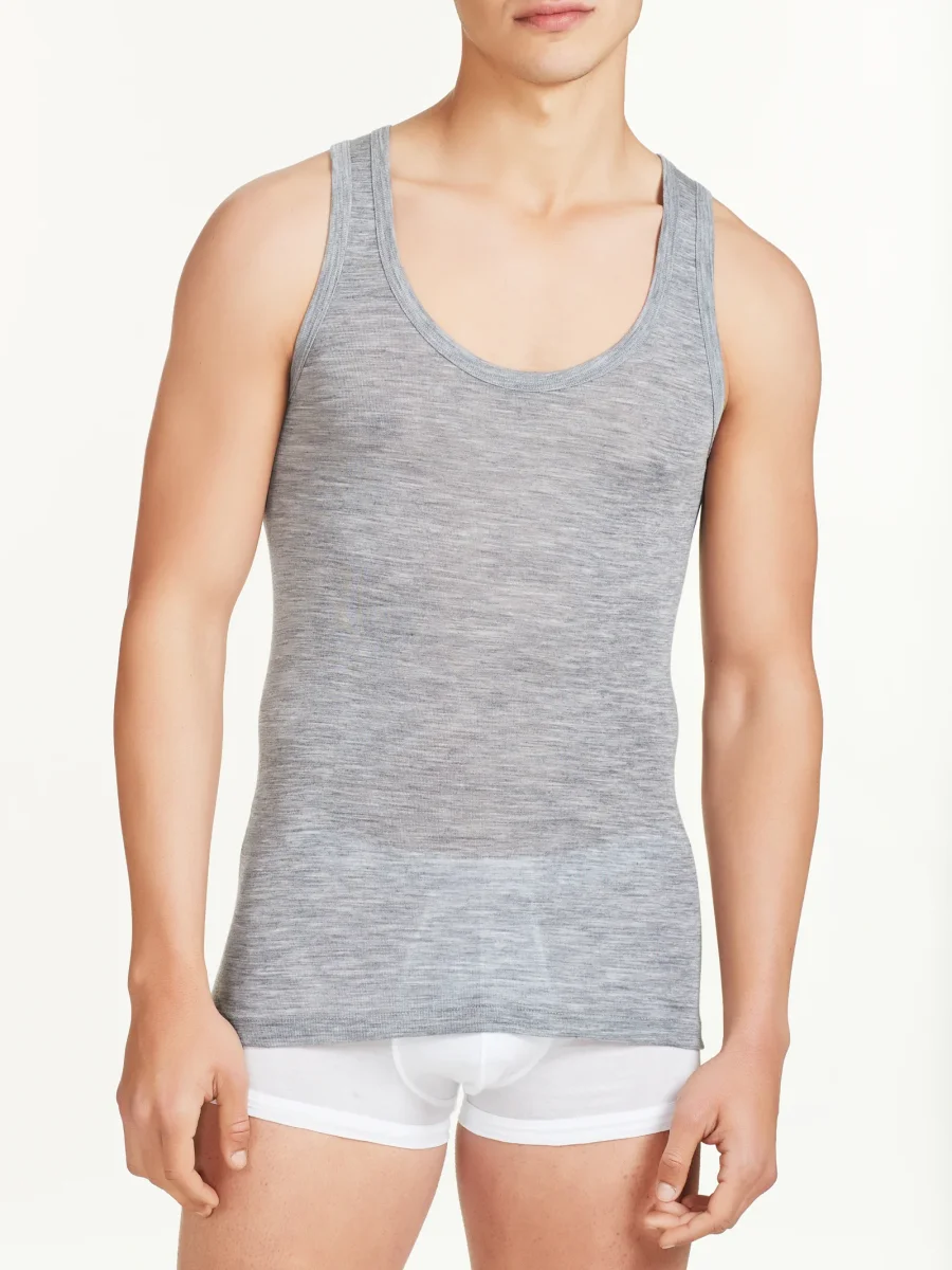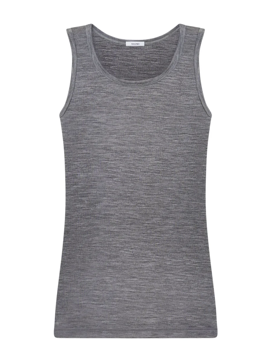 Canottiera spalla larga in pregiato tessuto a maglia unita in pura lana ultrafine, sottile e naturale.