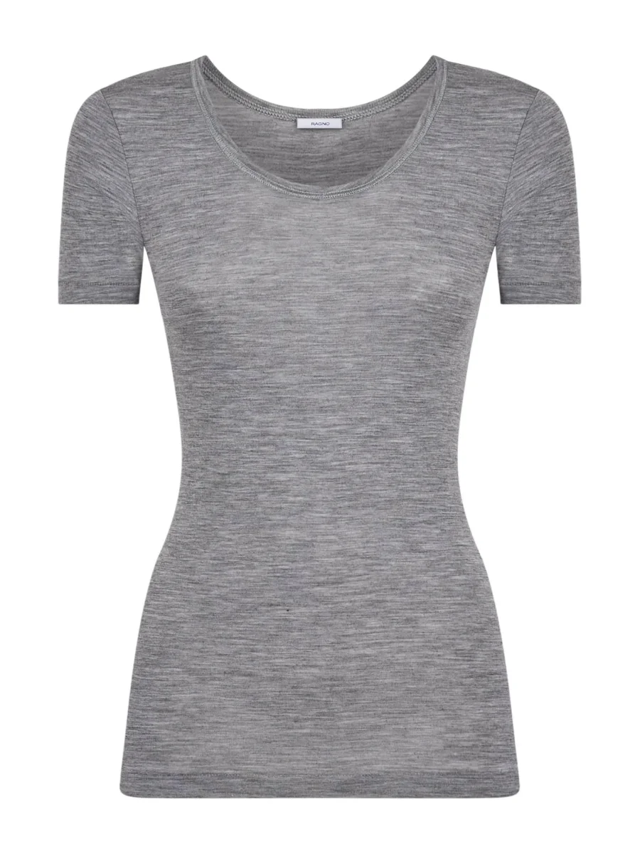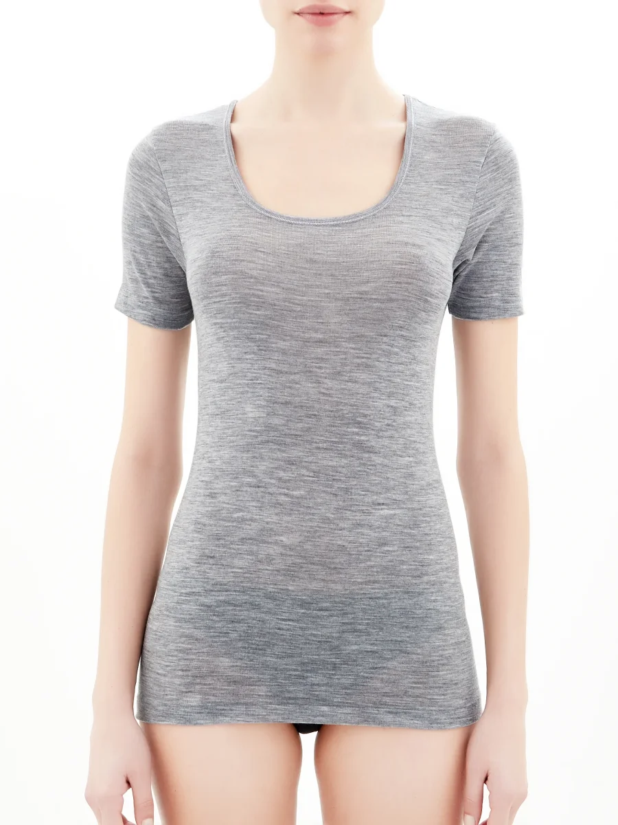 Maglietta girocollo a manica corta in maglia unita di pregiata pura lana ultrafine, sottile e naturale.