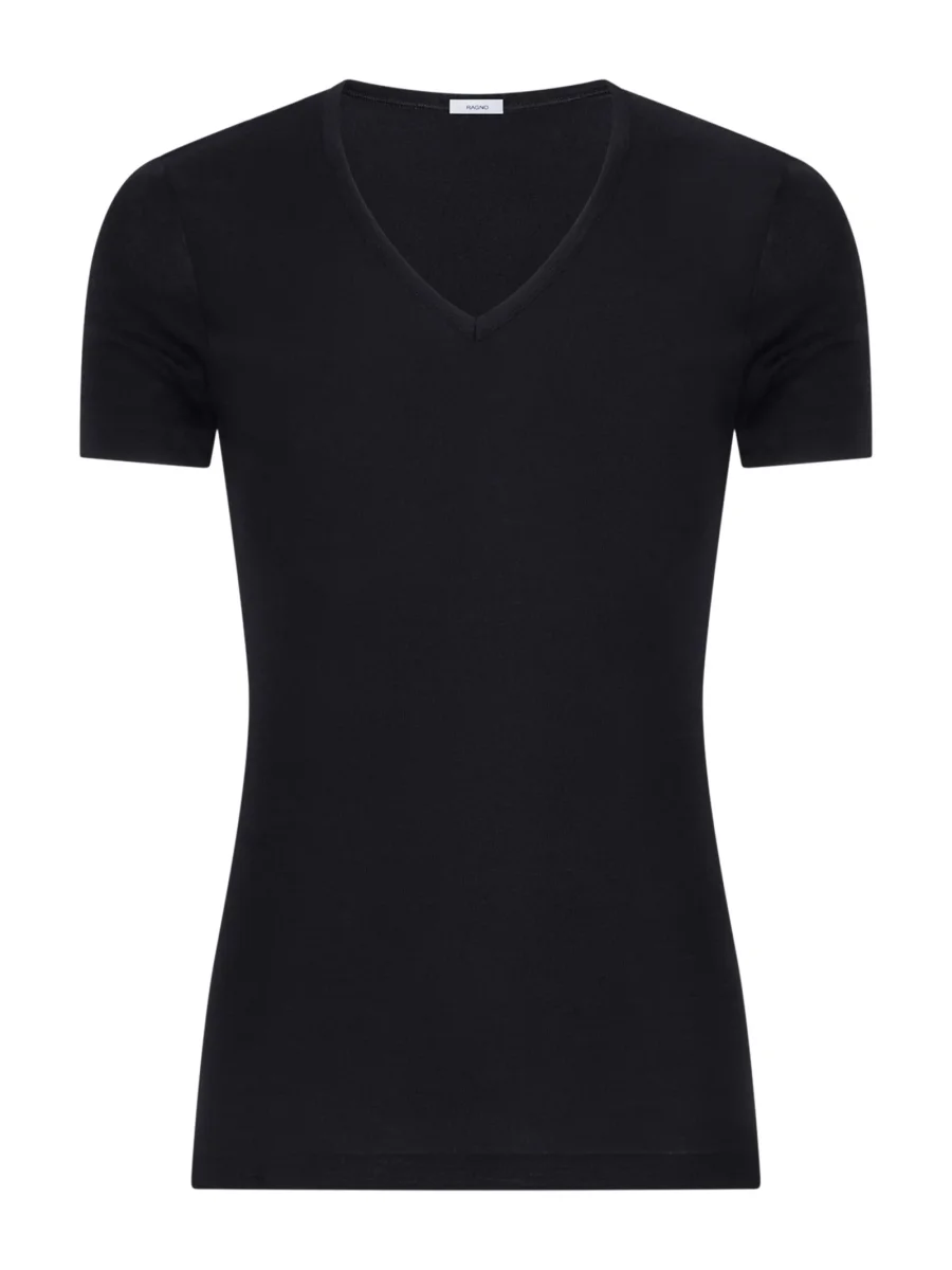 Maglietta con scollo a V a manica corta in pregiato e leggero tessuto a maglia unita in pura lana ultrafine, sottile e naturale.