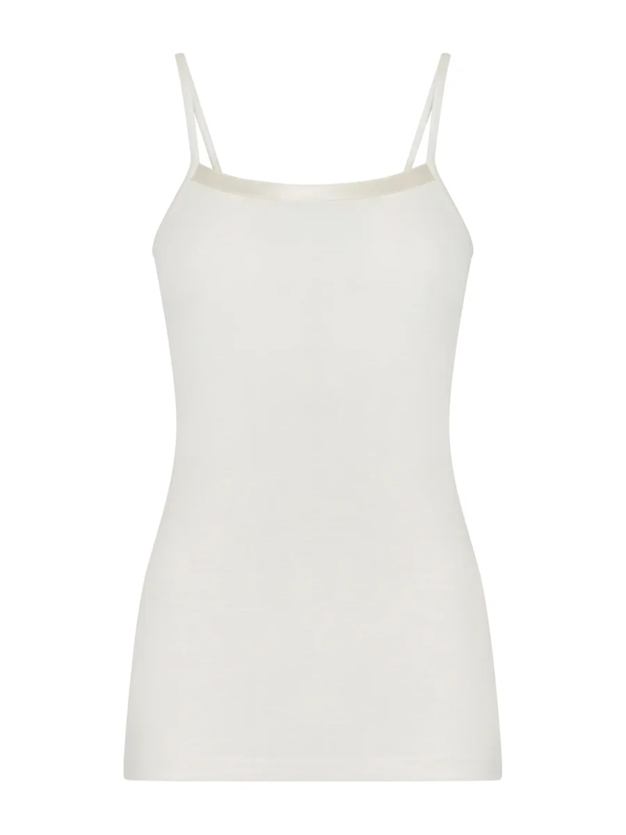 Top in maglia unita di pregiata pura lana merino ultrafine, sottile e naturale, caratterizzato dall’elegante profilo in raso sul bordo della scollatura.
